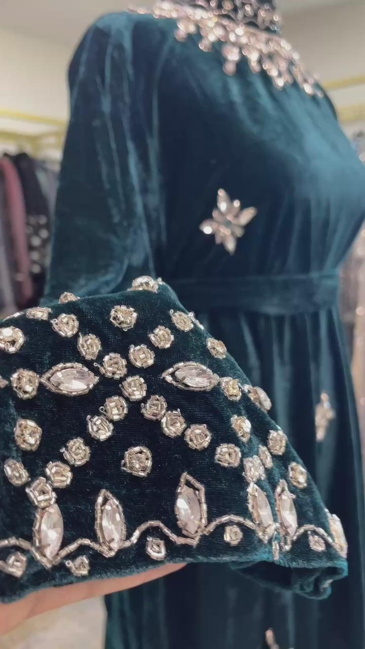 Modest Velvet Evening Gown with Rhinestones and Silver Beadwork