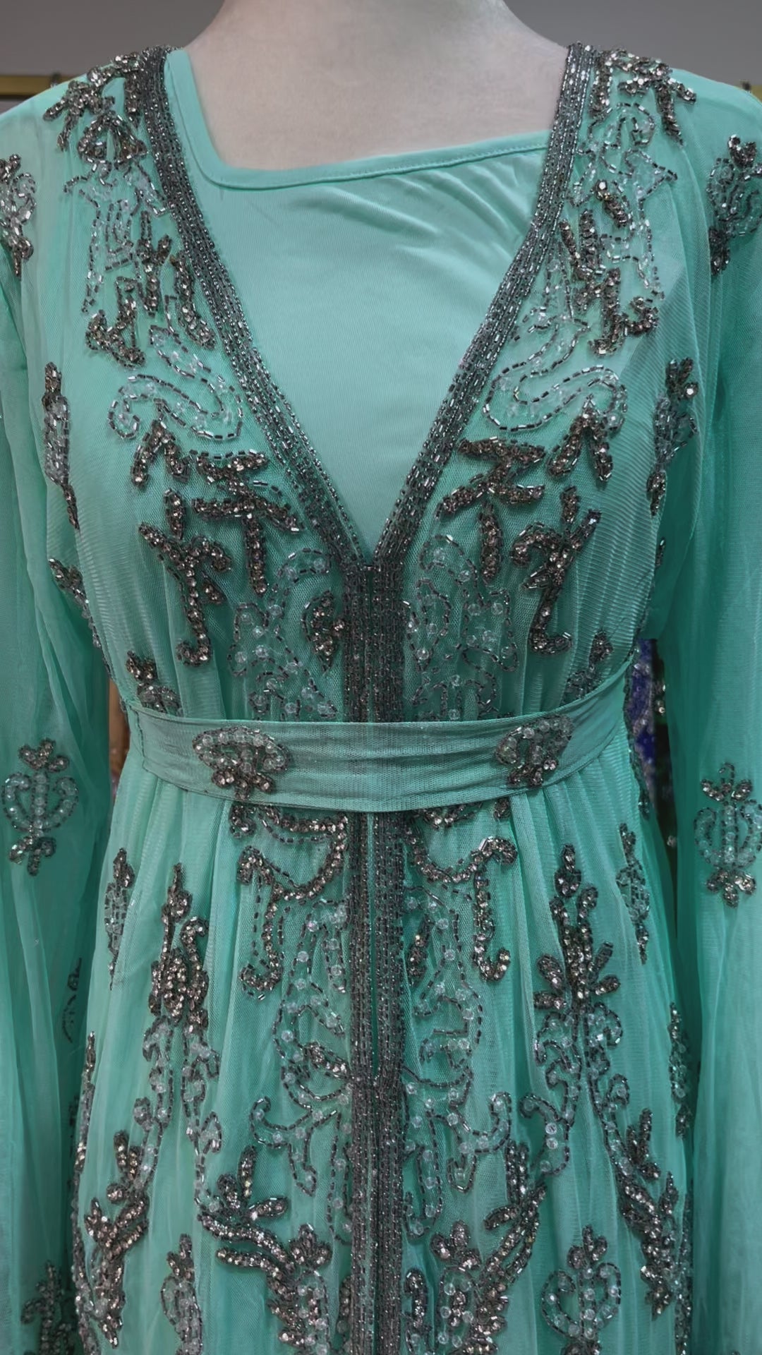 Turn heads in this exquisite light blue handmade evening gown, thoughtfully designed for modesty and elegance. Featuring an open front that secures with two small hooks and a coordinating belt, the dress includes a matching underdress for complete coverage. Lavishly adorned with dazzling rhinestones, and intricate beadwork, it shimmers beautifully with every movement. A sophisticated finish, making this fully lined gown perfect for weddings, formal evenings, and special occasions where you want to shine with timeless grace.