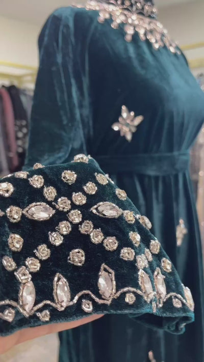 Elevate your evening look with this modest velvet gown, designed to capture timeless elegance and modern sophistication. The dress features hand-embellished rhinestones and delicate silver beadwork, adding a luxurious shimmer to every movement. Crafted from rich, soft velvet, this gown offers a graceful silhouette that flatters while maintaining full modest coverage.