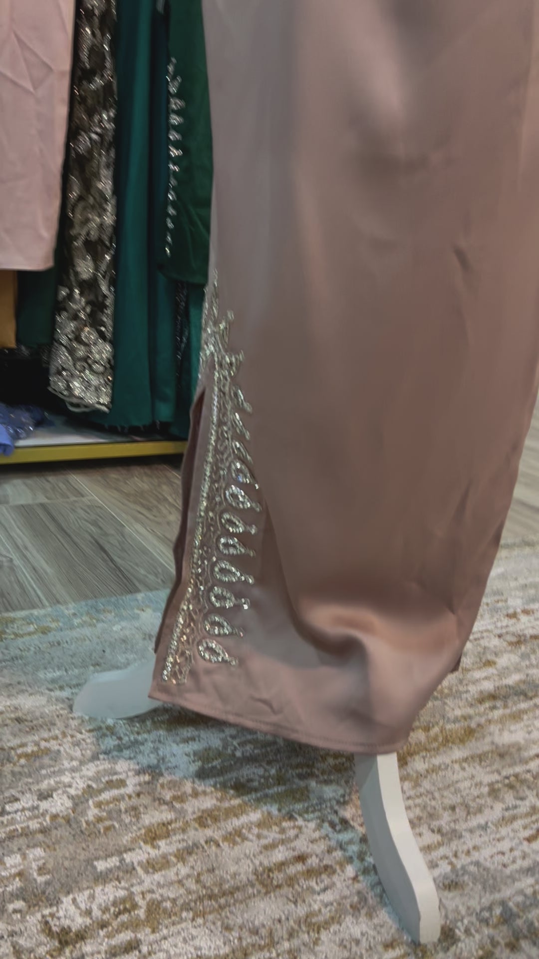 This Glamorous Pink Satin Gown is designed for unforgettable moments. Adorned with sparkling rhinestone accents, it offers the perfect blend of elegance and modern glam, ideal for weddings, formal dinners, or a luxurious evening out.